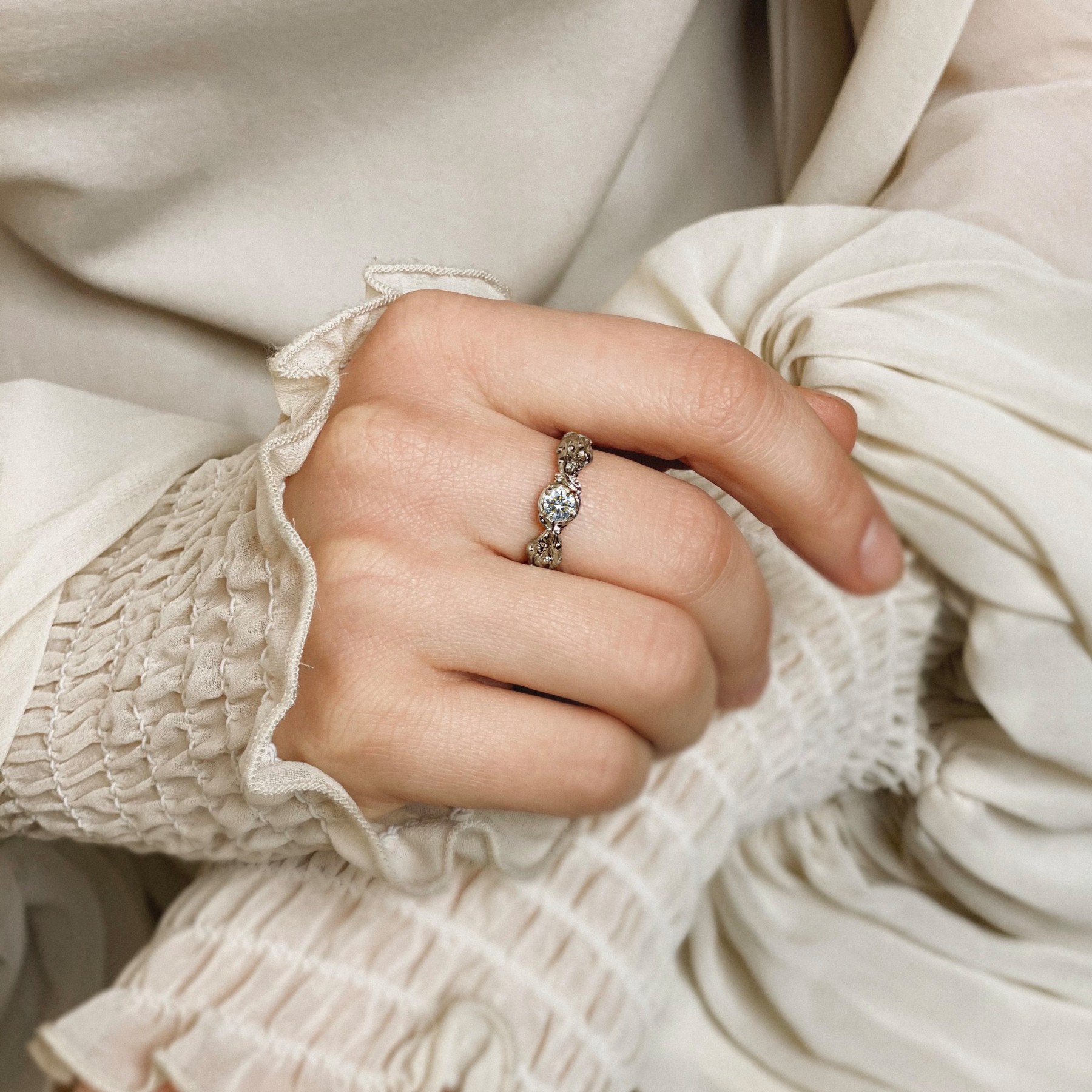 In the spring, nothing fills up so much as a leisurely walk outside the city. When you stroke the grass of the youth with your palm, you lie down on your back in decorated living carpets, gently touch the branches of trees and breathe in the aromas of flowering.Then you feel: spring is resurrected in every fresh shoot, secret tablets of nature are recorded on every young leaf. In each swollen bud, a new Universe awaits discovery! The perfection of nature always inspires us to create magical rings. They are like a spring flora, filled with freshness, energy and flavor change. They are the forerunners of the birth of a fantastic feeling…. And just like one fine day outside the window, everything explodes with lush greenery and a variety of colors, so in the warm heart of a morning, tender sprouts of love bloom suddenly. Isn’t spring created for this?Ring “Sprouts” — tender, filled with natural motifs, created to awaken love.