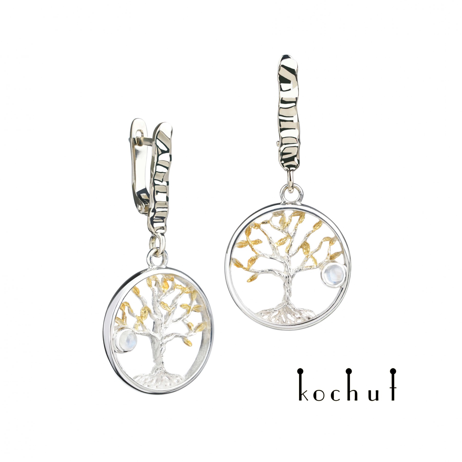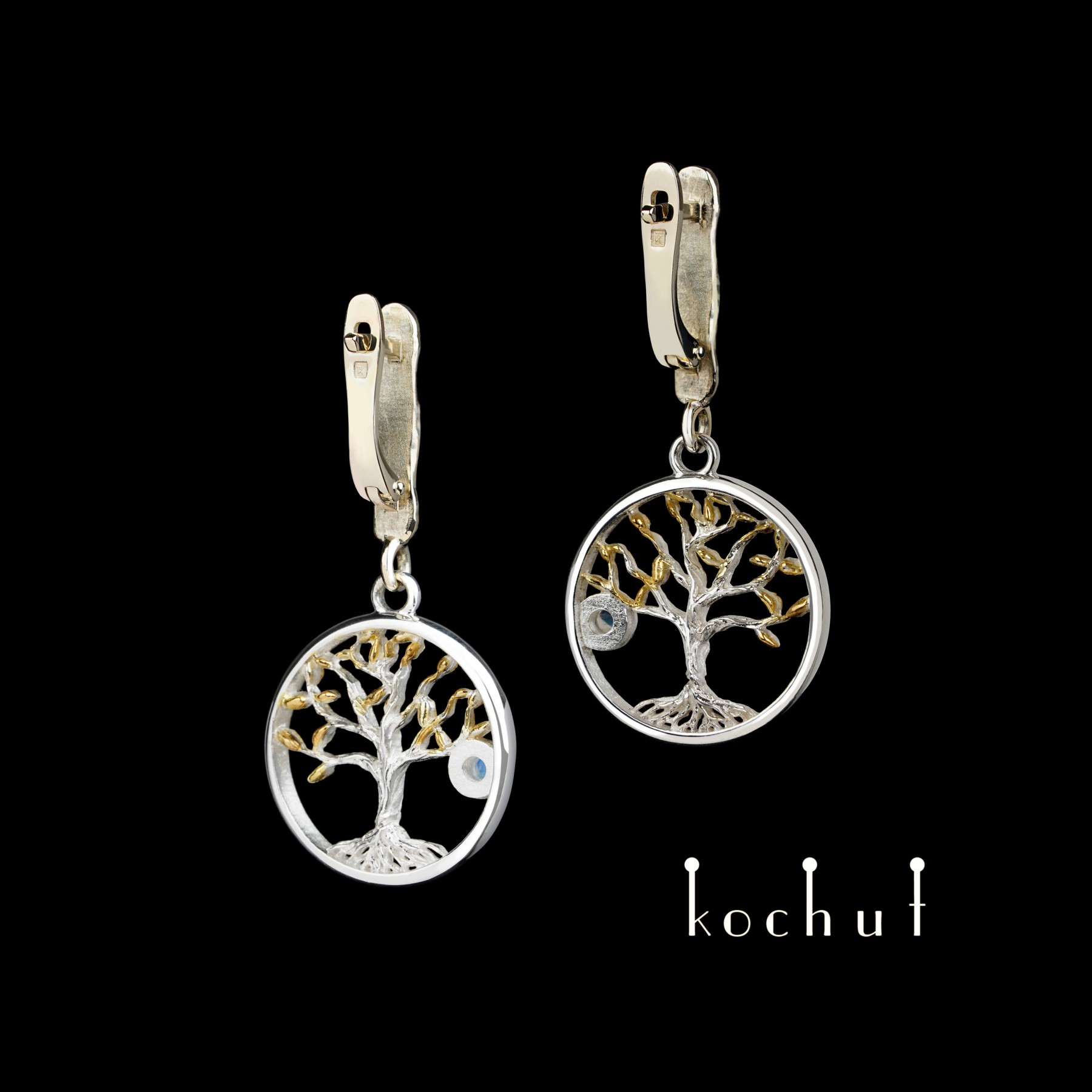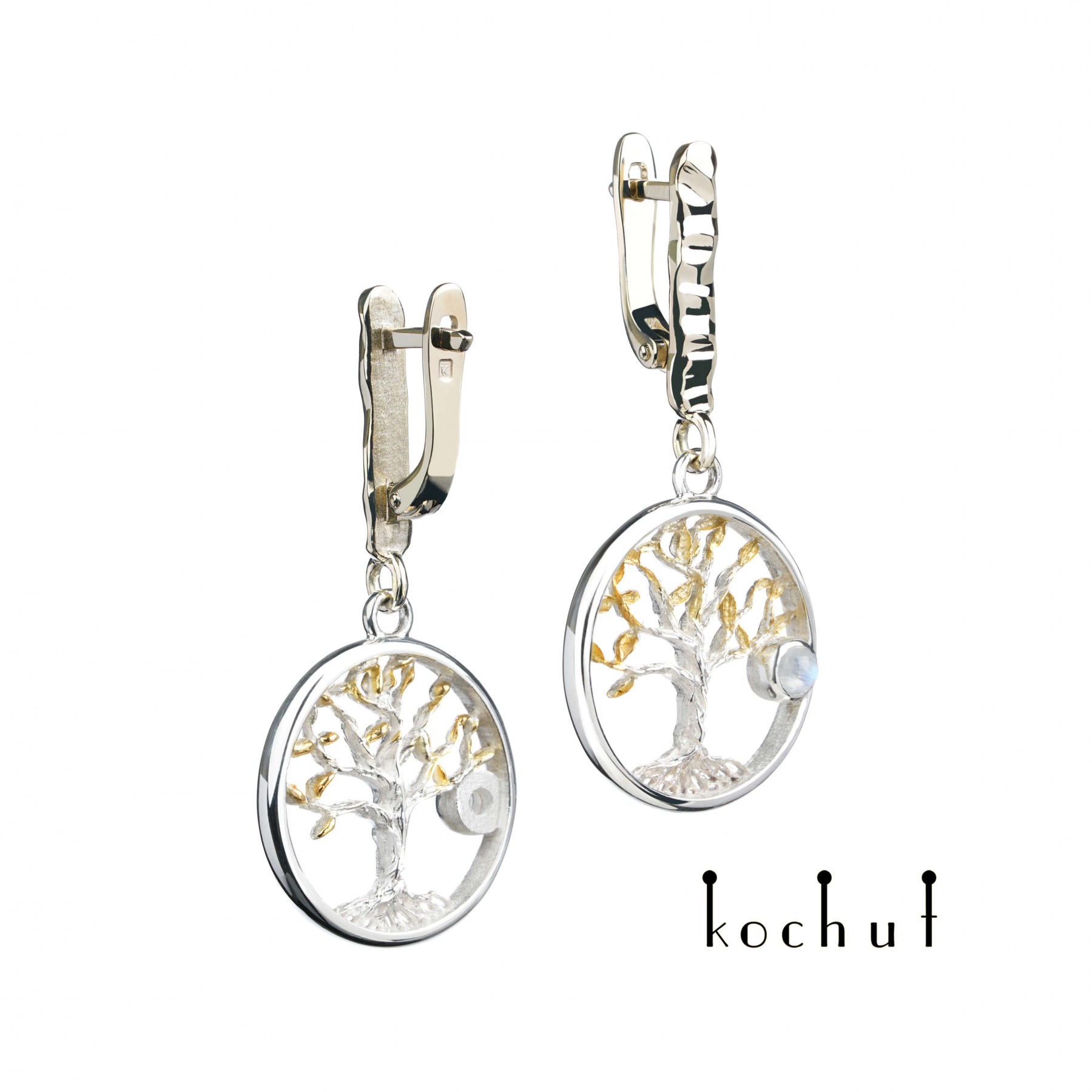 Life is built on opposing forces and dissonance. Fire and water, joy and sadness, rising and falling, doubt and confidence, truth and fabrication, birth and death. However, all the world strives for balance, and Nature is wise — she does not create excess and assiduously maintains her internal balance.A person’s life is also built on dissonance. Black stripes alternate with white ones, success is interlaced with troubles, unbridled joy goes hand in hand with sombre, gloomy moments.It is great wisdom to not simply accept one’s fate but instead walk confidently through the foreboding gates of uncertainty and doubt. Wisdom is not waging war with one’s circumstances or fiercely cutting through the abyss of one’s hardships and derision, and wisdom is not laughing through tears or forgiving the world of all the offenses it has wrought on you.No. To be wise means to accept real life and maintain one’s balance through spiritual insight. Neither anxiety, nor sadness, nor joy are endless. Only a person is infinite, and their wisdom, therefore, lies in their acknowledgment of the state of our universe.Confucius once said: «among those who run, stand still; among those who shout, be silent.»The tree of life is unique in that it radiates peace and tranquil contemplation. We accept the charms of life, forgive them for their fragility and happily welcome sadness, understanding it too is ephemeral.The tree of life is an important symbol for humankind.  The branches of the tree smoothly fill the silver space, revealing the mind, talents and spiritual potential, and each branch is a cell of the consciousness and soul.When a person works hard to grow their inner tree, the universe thanks them for their efforts with beautiful fruits bearing the aroma of a golden summer. A mysterious moonstone is also embedded in these earrings, which lends a cosmic charm to the piece.